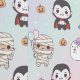 Een schattig en grillig behang met een charmant patroon van schattige, cartoonachtige Halloween-monsters zoals spoken, mummies en vampiers tegen een zachte pastelachtergrond.