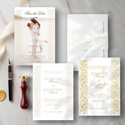 Chic Ecru Scrollwork Photo Wedding Save the Date