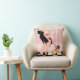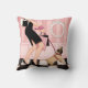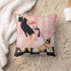 Prachtige illustratie van een elegante dame met boodschappentassen en een pug puppy op een hete roze as, met de vloer van de oogsttegel op de achtergrond, geschilderd door kunstenaar Maryline Cazenave.