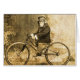 foto van een circuschimpansee, met een pet en een pak, terwijl je fietst.