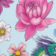 Een Chinees groen en paarse waterdraak met een oranje koi vis, lotusbloemen en kersenbloesems allemaal in water in een achtergrond van blauw.