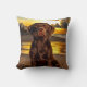 Een chocolade Labrador Retriever zit op een zandstrand en staart aandachtig naar de camera. De vacht van de hond is rijk bruin, contrasterend met de gouden tinten van de ondergaande zon. De lucht staat in lichterlaaie met levendige oranje en roze wolken, die reflecteren in het natte zand. De golven van de oceaan scheren zachtjes langs de kust, waardoor een rustige en serene sfeer wordt gecreëerd. Ideaal cadeau voor labrador liefhebbers.