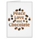 Chocoladeliefhebbers weten dat je chocolade nodig hebt om vrede en liefde in je leven te hebben. Geniet van dit heerlijk uitziende design met de chocolade-snoepjes en de woorden Peace Love and Chocolate.