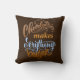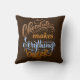 "Chocolade maakt alles beter" verklaart de gestileerde tekst aan beide zijden van deze kussen. De kleuren van de tekst omvatten lichtbruin, goud, en lichtblauw.
