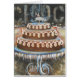 Drie gebluste chocoladetaart zit op een immense plek voor een publiek. Een echte uitvoerder wordt over de bovenkant verlaagd in een gedurfde evenwichtsdaad.