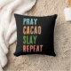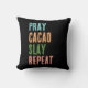 Christelijk PRAY CACAO SLAY REPEAT Sierkussen in retro kleuren en grunge sans serif typografie. Dit citaat is een geweldig alternatief voor de gebruikelijke EAT SLEEP COFFEE REPEAT-slogan en zou een ideaal geschenk zijn voor christenen die de voordelen van cacao boven koffie verkiezen. Koop dit cacao gooi kussen en bijpassende geschenken om je cacao hoek thuis te versieren, of voor een stijlvolle cacao inrichting.