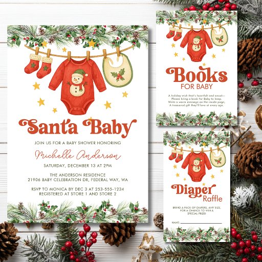 Celebrate the joy of the season and a sweet new arrival with this Santa Baby Christmas Clothesline Baby Shower Invitation. Featuring an adorable watercolor design of a festive baby bodysuit, stockings, and bib hanging from a holiday clothesline, this invitation perfectly blends cozy Christmas charm with baby shower cheer. The classic red and green color palette, pine greenery, and star accents create a warm and whimsical feel — ideal for winter baby showers, December celebrations, or holiday-themed parties.