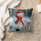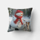 A cheerful snowman in a red knitted hat and scarf joyfully skates on a frozen pond, while a playful terrier dog joins the fun against a snowy forest backdrop