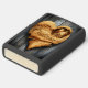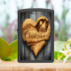 Een houten hart met een gebeeldhouwde wolf die huilt bij de maan, de naam Christopher staat hieronder.