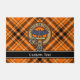 badge de crête d'Halloween avec chauve-souris volante entourée d'une sangle et boucle sur l'arrière - plan tartan. Texte personnalisé.
