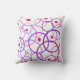 Deze decoratieve werpen kussen kenmerkt een wit geometrisch patroon van het herhalen van, overlappende cirkels in schaduwen van roze, blauw, paars en magenta op een witte achtergrond. De kleine rode cirkels zijn verspreid over het geheel.