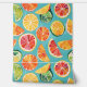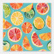 Dit kunstwerk toont een levendig en verfrissend patroon van citrusvruchten, met levendige plakjes sinaasappel, citroenen, limoenen en grapefruits tegen een felle turquoise achtergrond. De sappige, kleurrijke fruitschijfjes worden afgebeeld met een speelse en gestileerde benadering, die de essentie van zomertijd en frisheid vastlegt. Het gebruik van gedurfde, contrasterende kleuren en de cirkelvormige opstelling van de vruchten creëer is een dynamische en opvallende compositie die energie en lust uitstraalt.
