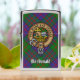 Clan MacDonald crest badge omringd door een riem en sluiting over tartan achtergrond. Aangepaste tekst.