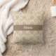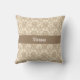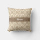 Een prachtig damast patroon in beige op een bleke tan achtergrond creëer een elegant werpkussen. Personaliseer met jouw naam in een donkerbeige band in het midden.