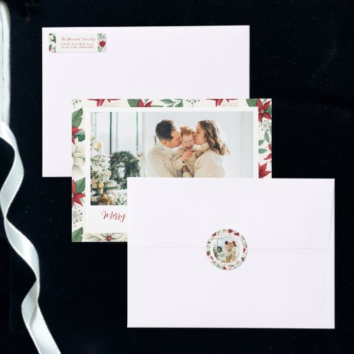 Apportez de la joie à vos proches près et loin avec cette carte de voeux de Noël élégante avec un favori de vacances classique, la pointsetta. Personnalisez la carte avec votre propre salutation et photo. Pour obtenir de l'aide sur cette conception, veuillez envoyer un courriel à hello@fivelittlelemons.com