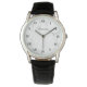 Classy mannen Bekijk cadeau idee met aangepaste naam of monogram initiaal letters. Luxe script typografie sjabloon met fancy witte marmeren steen achtergrond textuur. Cool gepersonaliseerd cadeau voor mannen Verjaardag, Vaderdag of pensioenfeest. Maak je eigen voor vader, oom, broer, vader, man, opa, opa, stiefvader, zoon, bruidegom, groomsmen etc. Romeins nummer wijzerplaat bord. Mannelijk design met luxe design. Zwart lederen band.