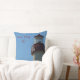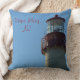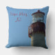 Groot omkeerbaar decor kussen van de Cape May, New Jersey vuurtoren in rood en wit met een lichtblauwe lucht. Achterkant van het kussen is een effen blauwe achtergrond met woorden Jersey Shore! Copyright © TamiraZDesigns. Alle rechten voorbehouden.