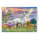 Deze vreedzame scène in pastel huurt show een lama met een engel in de wolken die kijkt over een prachtig landschap van bergen en kleurrijke bladeren. De zon breekt door de wolken en de vredegebieden.