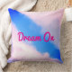 Coussin avec ciel bleu avec nuages roses et texte "Dream On" (que vous pouvez customiser).