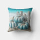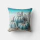 Zeegolven scheren zachtjes langs de zandkust waar drie blauwe pompoenen naast een rustiek houten hek rusten