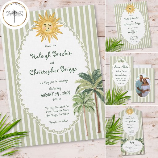 This whimsical coastal wedding all in one wedding invitation with dinner choices features a vintage sun motif, lace border, palm tree, and stylish sage green stripe background. Perfect for a beach or California destination wedding. Created by Simply Farmhouse Press.