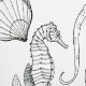 Een geweldige peel en stick behang voor iedereen die houdt van het mariene leven, of kust levende decor. Dit behang heeft een eenvoudige witte achtergrond met zee creature gedaan in zwarte lijn art. Kenmerken schildpadden, octopus, zeepaardje, koraal, schelpen, zeewier. Zeer geschikt voor elke kamer in een strandhuis, of kustthemadecor.