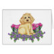 Un petit chiot de cocker se reposant en fleurs pourpres.