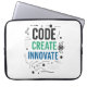 "Bewaak uw creatiehub met dit sleeve met een innovatief thema met 'CODE CREËER INNOVATE' en binaire patronen - neopreen van militaire kwaliteit absorbeert schokken terwijl het de reis van de maker aandrijft. Waterbestendig + past op 13-16-inch laptops met antislipbasis. Essentieel voor ontwikkelaars en hardware-vernieuwers. **Beveilig vandaag nog uw digitale workshop!**"