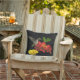 Ce beau coussin extérieur floral présente un colibri rubis-throated femelle. Elle plane dans le ciel tout en buvant du nectar du centre d'or d'une fleur rouge lumineuse de zinnia. Une fleur jaune de zinnia est voisine et quelque feuille de vert accomplit la composition. Tous sont placés sur un arrière - plan noir. L'image est répétée sur le dos.