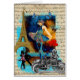 Le collage contemporain romantique assez féminin des danseurs et de la fille dedans avec Tour Eiffel Paris France, les papillons et une illustration vintage drôle de vieux livre de voiture de steampunk avec un chef indien tenant les ballons rouges romantiques de coeur d'amour sur un bleu ont affligé l'arrière - plan avec un vieux texte manuscrit de lettre. Customisez cette conception en ajoutant votre propre texte.