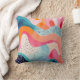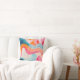 Een kleurrijk, levendig werpkussenontwerp van een abstract dessin met wervelingen, vormen en stippen in kleuren van roze, sinaasappel, groen, geel, wit en zwart. Het patroon zit aan beide kanten van het kussen.