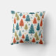 Red, gold, green, and blue stylized trees on a snowy background makes a festive and cheerful throw pillow for the holidays.