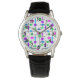 Dit horloge heeft een modern, midden-eeuwse vormgeving van een raster gemaakt van horizontale en verticale zwarte lijnen met rechthoeken in verschillende levendige tinten groen, blauw en paars.