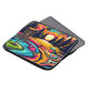 Retro disc golfbaan met een psychedelische zonsondergang, volle maan, wervelend kleurrijk water.