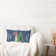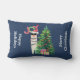Een lumbale kussen met een grappige illustratie. Een schattige lama met een zwarte zonnebril en een rode kersthoed. Ik sta achter een kerstboom met feestelijke cadeaus. Het woord Joy schreef boven zijn hoofd in een kleurrijk vakantiescherm. Reeks op een blauwe achtergrond. Fantastisch en leuk kerstontwerp. De tekst zegt Zalig Kerstfeest, Prettige feestdagen.