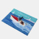 Labrador Deuren Mat. Super Cool Labrador Retriever honden hebben plezier met hun motorboot in het zee. Gele labrador chauffeur is zo koel als ijs!! Black Labrador is een ster! Chocolate Labrador houdt het leven vol. Leuk voor hondenliefhebbers die van Labradors houden. Prachtige zomervakantie-Uitzicht met Labradors en Zee en een boot en een lichthuis. Whimsical and grappige Labrador Summer Painting geschilderd door Naomi Ochiai.