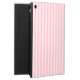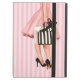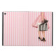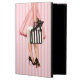 Achats élégants de dame avec le chiot de bouledogue français sur l'arrière - plan rose rayé. Peint par l'artiste Maryline Cazenave.