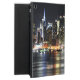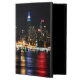 Superbe couverture iPad Air avec une photo colorée de l'horizon de New York la nuit, avec ses bâtiments éclairés se reflétant dans la rivière sombre.