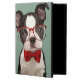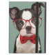 Illustration mignonne des verres de port d'un oeil de chiot de terrier de Boston de style de hippie et de la cravate d'arc rouge chic sur l'arrière - plan bleu. Conçu par Maryline Cazenave.