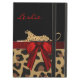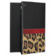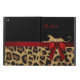 Stylish iPad Air coque, avec stand intégré et graphiques d'un motif en fourrure de jaguar marron tacheté et noir, sur le fond, avec un noir solide sur le dessus, du coque. Les graphismes d'un ruban rouge satiné coule au milieu et a un joli arc rouge, sur le côté droit. Les graphiques d'un gros chat à pois sauvage semblent se trouver au-dessus du ruban. Personnalisez le texte rouge. Fait une excellente idée cadeau.