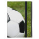 Une photographie d'un ballon de football se reposant sur l'herbe verte.