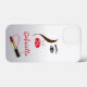 © Sunny Mars Designs. Face & Lipstick Make Up Artist Cell Phone Boîtes - Coiffure chic branchée et beauté maquillage cosmétique design moderne féminine Coque-Mate couverture avec visage femme, lèvres pleines, yeux bleus, cheveux bruns et nom en rouge à lèvres. Personnalisez-le en y ajoutant votre propre nom ou autre texte. Un cadeau parfait pour les maquilleurs, les esthéticiennes ou les cosmétologues.