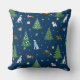 Een schattig kussen met speelse teckels, Dalmatiërs en Westies omringd door sneeuwvlokken, versierde sparren en feestelijke cadeaus. Het winterse ontwerp, tegen een blauwe achtergrond, brengt een vrolijke kerstsfeer naar elke ruimte.