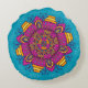Lance ronde oreiller avec un design mandala dans des couleurs vives de rose, orange, jaune et bleu.