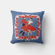 Vierkante dansers in rode outfits met een rand om hen heen en tekst die SQUARE DANCING zegt. De achtergrond is een FAUX denim print. Dit kussen heeft een groot printontwerp op de voorkant en een kleinere herhalingsprint op de achterkant.