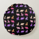 Dinosaures colorés motif sur coussin de lancer rond en polyester brossé personnalisé. Arrière - plan noir - facile à customiser.