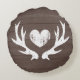 Jolie chasse thème cerf de bois rond à la décoration coussin. Ersonaliser avec le nom les lettres initiales de la mariée et mariée nouvellement mariée / mari et femme. décor rustique vintage pour mariage, restaurant, café, chambre, canapé, lit ou canapé. Décorations romantiques sur le thème extérieur. Rustique Coeur défraîchi avec monogrammes de nom personnalisable. Patiné vieux regard en détresse typographie. arrière - plan Brown panneau de grains de bois. Texture de grange en bois. Chasse en plein air / thème de chasse.