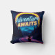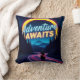 Fuel your wanderlust with this vibrant "Adventure Awaits" throw pillow. Featuring a lone rider on a winding forest road under a glowing neon arch, this cushion is the perfect accent for explorers and travel enthusiasts. Bring the spirit of the open road into your living room or bedroom.