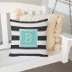 Ajoutez un style audacieux et moderne à votre patio, à votre terrasse ou à votre piscine avec notre oreiller extérieur monogrammé en noir et blanc chic avec une pop d'aqua. Le design présente de larges bandes horizontales en noir et blanc sur les deux côtés, avec votre monogramme initial unique sur le devant en aqua turquoise estivale vibrante.