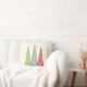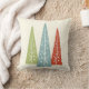 Cet oreiller à thème de Noël illustre un trio d'arbres à feuillage persistant dans un style simple et moderne, vert clair, bleu clair et rouge contre un arrière - plan crème. L'envers a une coordination sur tout le motif des arbres.